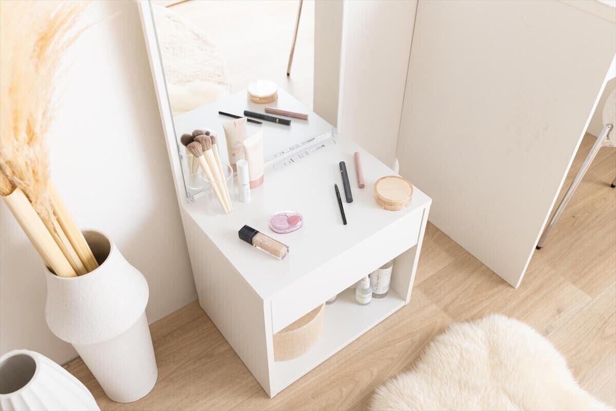 床に座ってのびのびメイクができるコンセント付きドレッサーテーブル。大きな鏡と引き出し収納付きで、毎日のメイク時間が効率よく快適に。省スペースで置けるコンパクト設計&ロー設計のため、ワンルームや一人暮らしの方にもおすすめです。また無駄な装飾のないノイズレスなデザインは、空間をすっきりと見せ、洗練された雰囲気を演出。シンプルで飽きが来ないため、長くご使用いただけます。