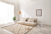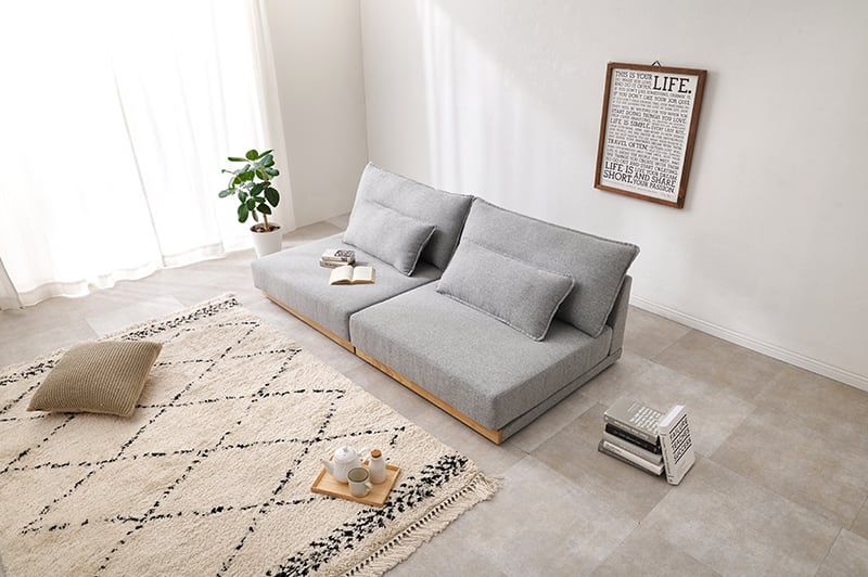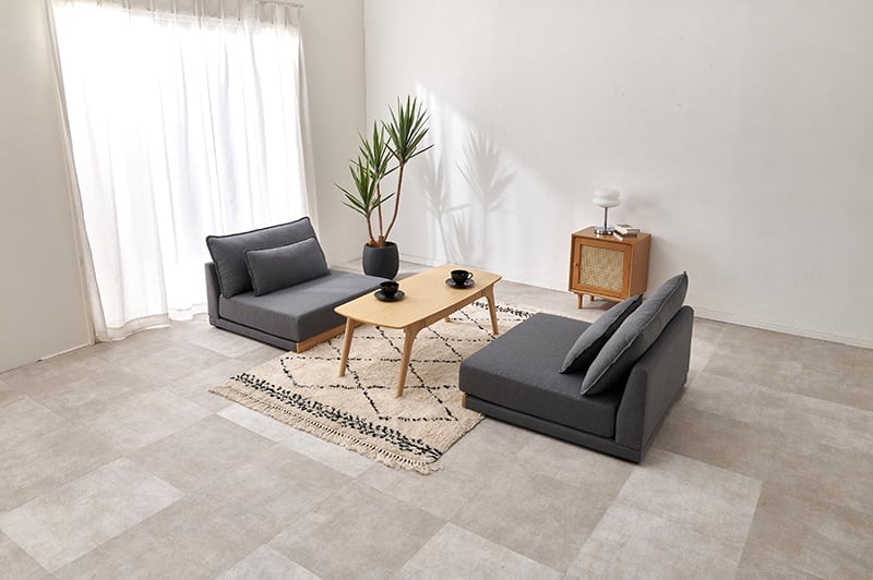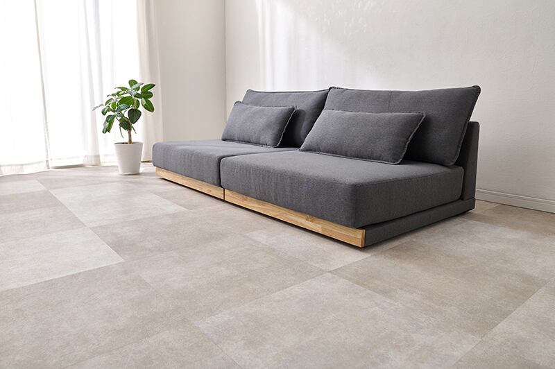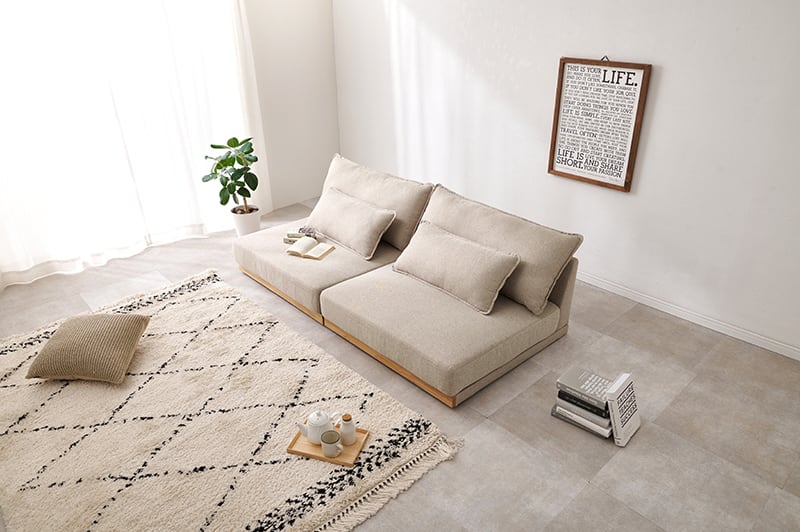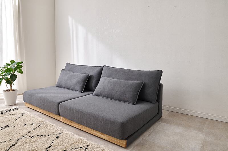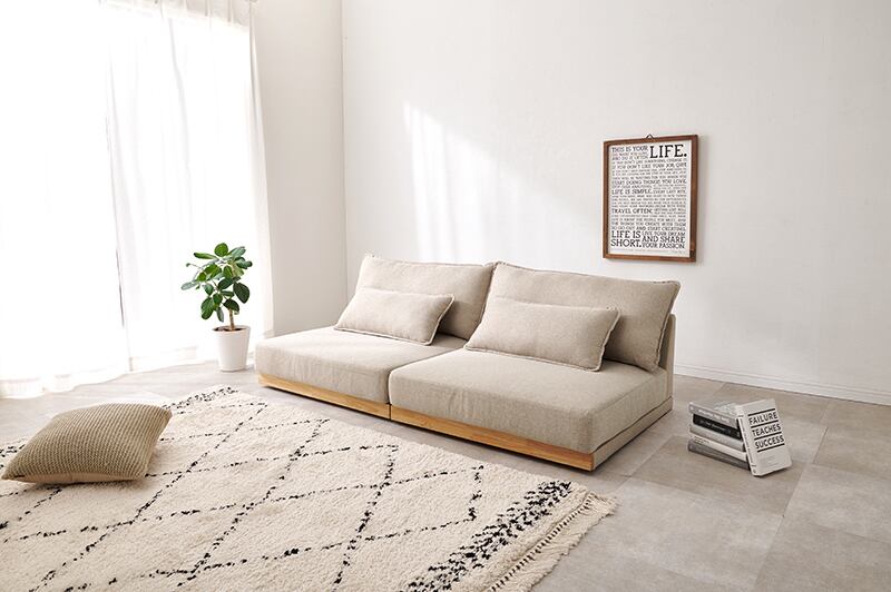 アームレスタイプの幅広ソファなのでゆったりとくつろげます。背もたれクッションと座面にフェザーが入っており体を優しく包み込むような座り心地。