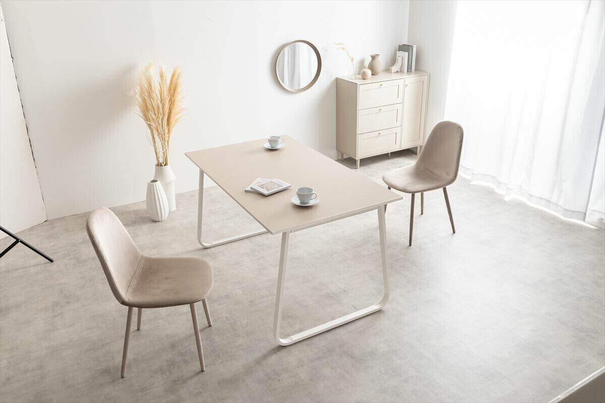 シンプルさの中に個性が光るダイニングセット。特徴あるフォルムのテーブルとベロア生地のチェア・ベンチは置くだけで洗練さを演出します。また天板は広く、お手入れもしやすいため、長く快適に使えるのも嬉しいポイントです。さらにチェアとベンチは座り心地にもこだわりました。特別感のある空間で、ゆったり食事をお楽しみいただけます。